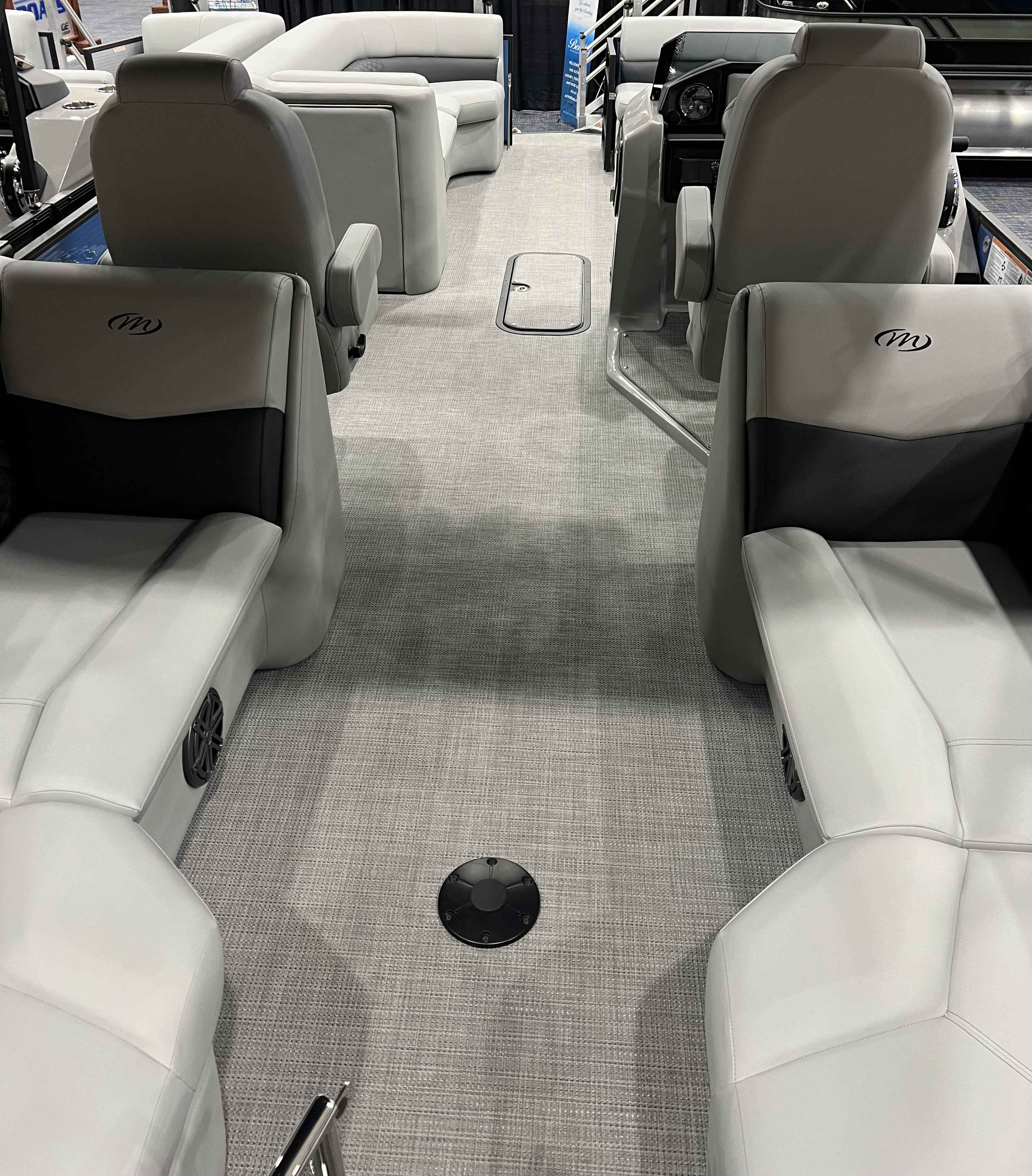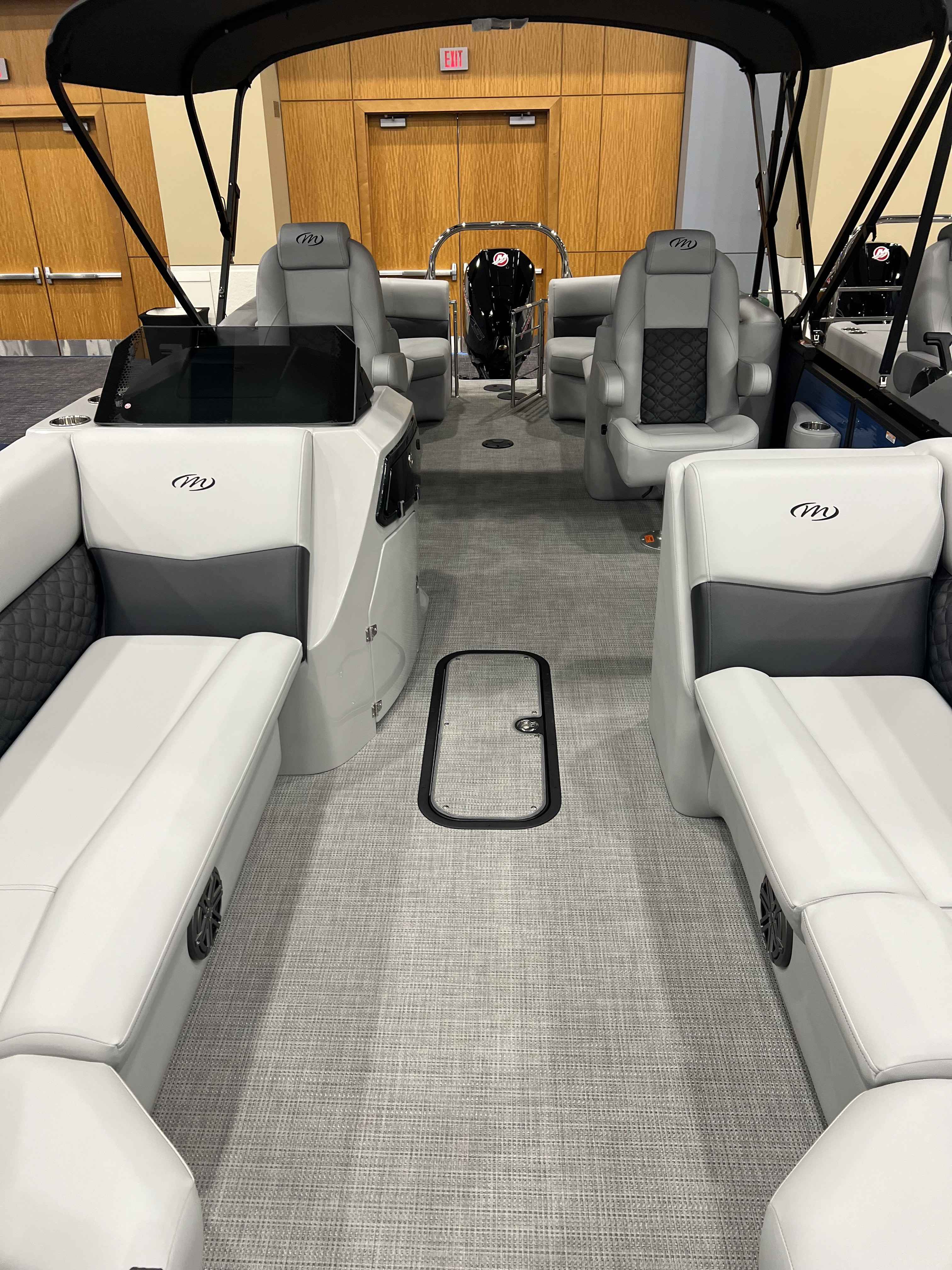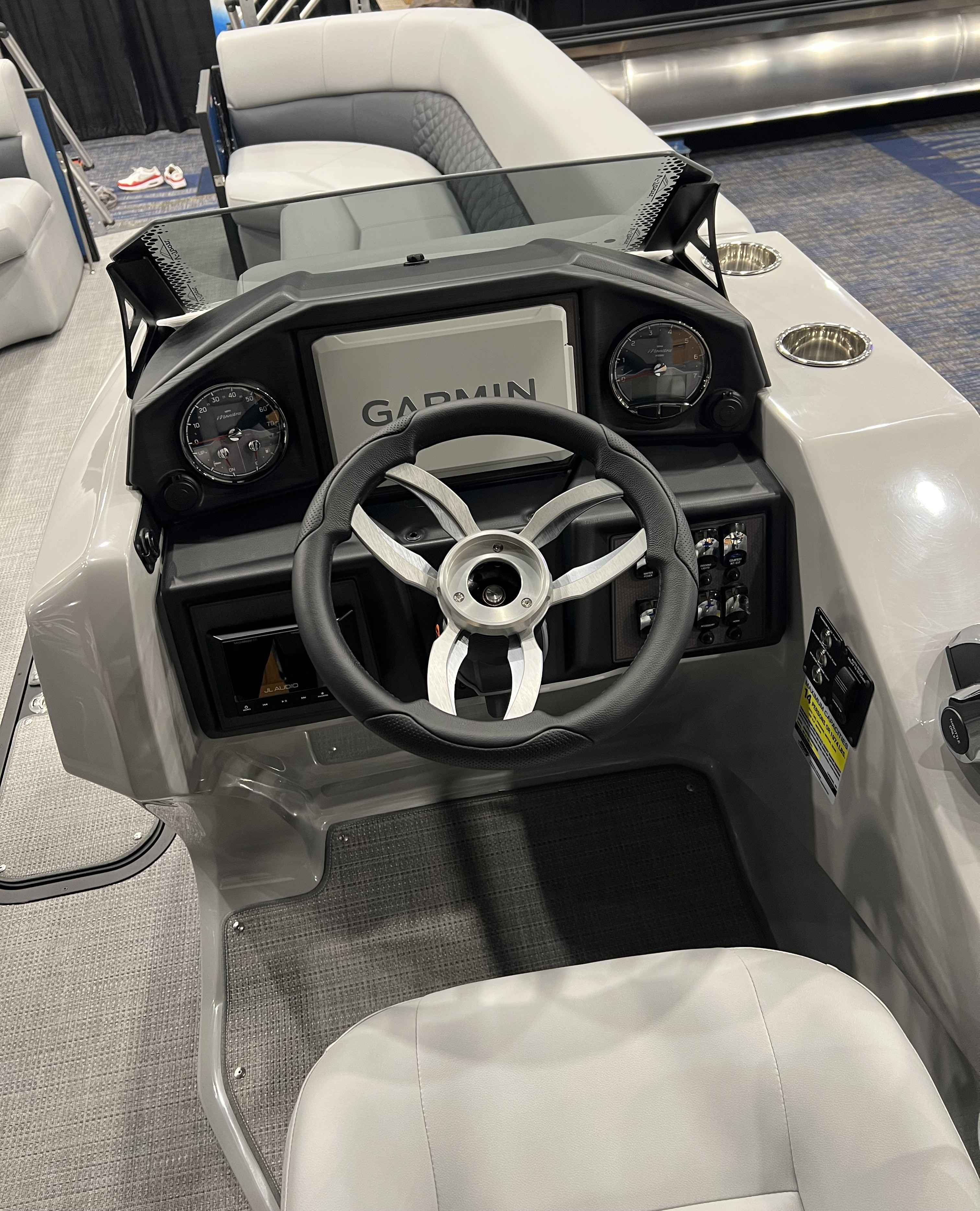 - Fully Transferable Warranty To Second Owner. Limited Lifetime On Decking Warranty and Structural Warranty. 5- Year Warranty On Furniture Vinyl Mooring Covers Floor Coverings and Bimini Fabric. 7- Year Component Warranty. Limited Lifetime Deck Warranty. LED Bimini Anchor Light. Bimini w/ Bimini Top and Boot. Mooring Cover. Built-In Cupholders and 2 Portable Cupholders. Woven Vinyl Flooring. Comfort Touch Marine Vinyl Furniture Hands Free Seat Hinges. Gas Tank - V-Toon 43 Gallon. Wide 4 Step Rear Entry Ladder. Blue LED Lighting on the Interior. LED Lighting for the Wall and Docking/Navigation. Color Matched Mooring Cover. Master On/Off Battery Switch. Dinette Table. USB Port at the Helm. Garmin Display ( Echo Map Plus 9"). Raised Fiberglass Helm Chair w/Slide Access Door. High Back Helm Chair w/Recliner. Helm Chair Slider. Horn. LED Courtesy Light. Sound System ( Fusion Stereo and 4 Speakers). Premium Steering Wheel. Windscreen. Extruded Aluminum Crossmembers. Stainless Steel Fasteners. Hybrid Rotomold Furniture. Lift Gates. Flip Up Cleats Stainless Steel(4). Mooring Eyes. Motor Mount- Aluminum w/Splash Shields. NMMA Certified using ABYC Standards. Anti-Spray Integrated Splash Fins on Nose Cones. Full Length Pontoon Tube Riser. Riser Brackets (M Style). Powder Coated Rub Rail . Transducer Bracket. Deck draining Wall Spacers. Heavy Duty Wall Tubing ( .090" Thick 1.25"Sq.). Powder Coated Wall Tubing. VPII - Up to 200 HP ( VPII Center Tube Lifting Strakes (2) Barracuda Nose Cones and No Billet Transom). SHP- Up to 400HP ( Sea Star Power Steering SHP Lifting Strakes on All Tubes (6) Barracuda Nose Cones and Billet Transom on Top).
