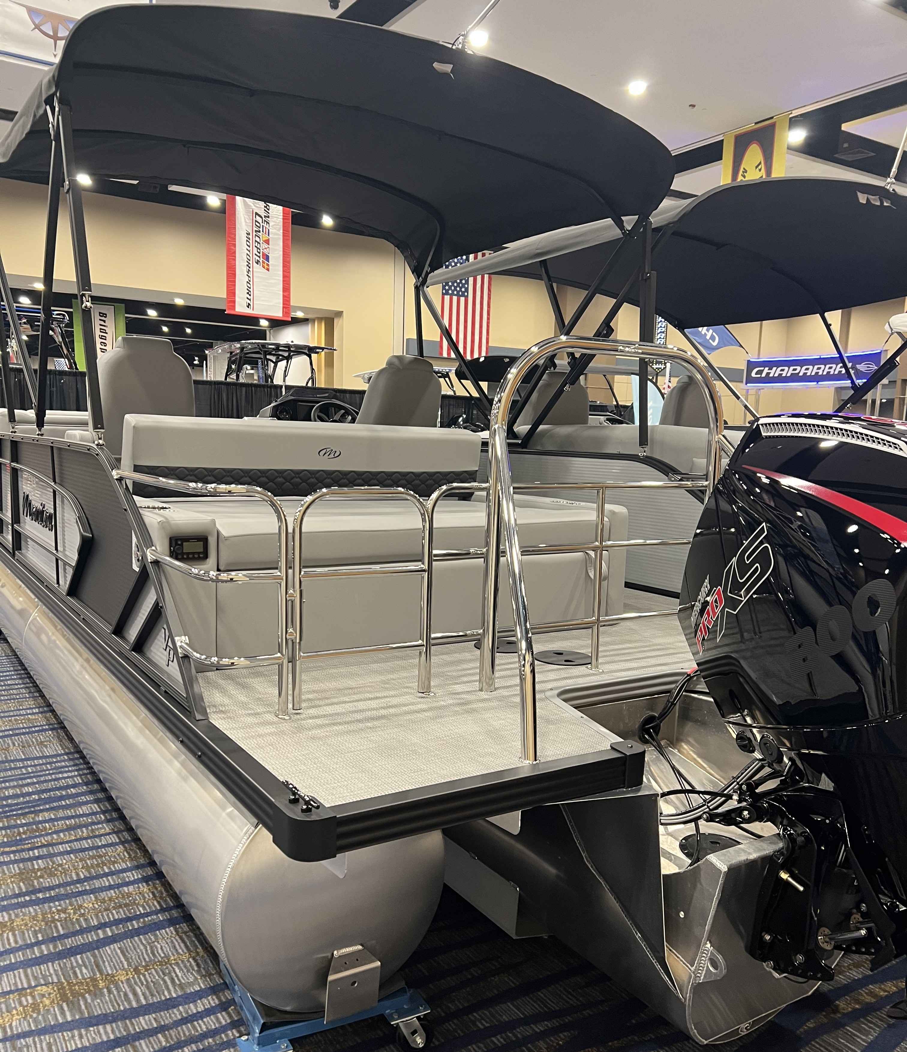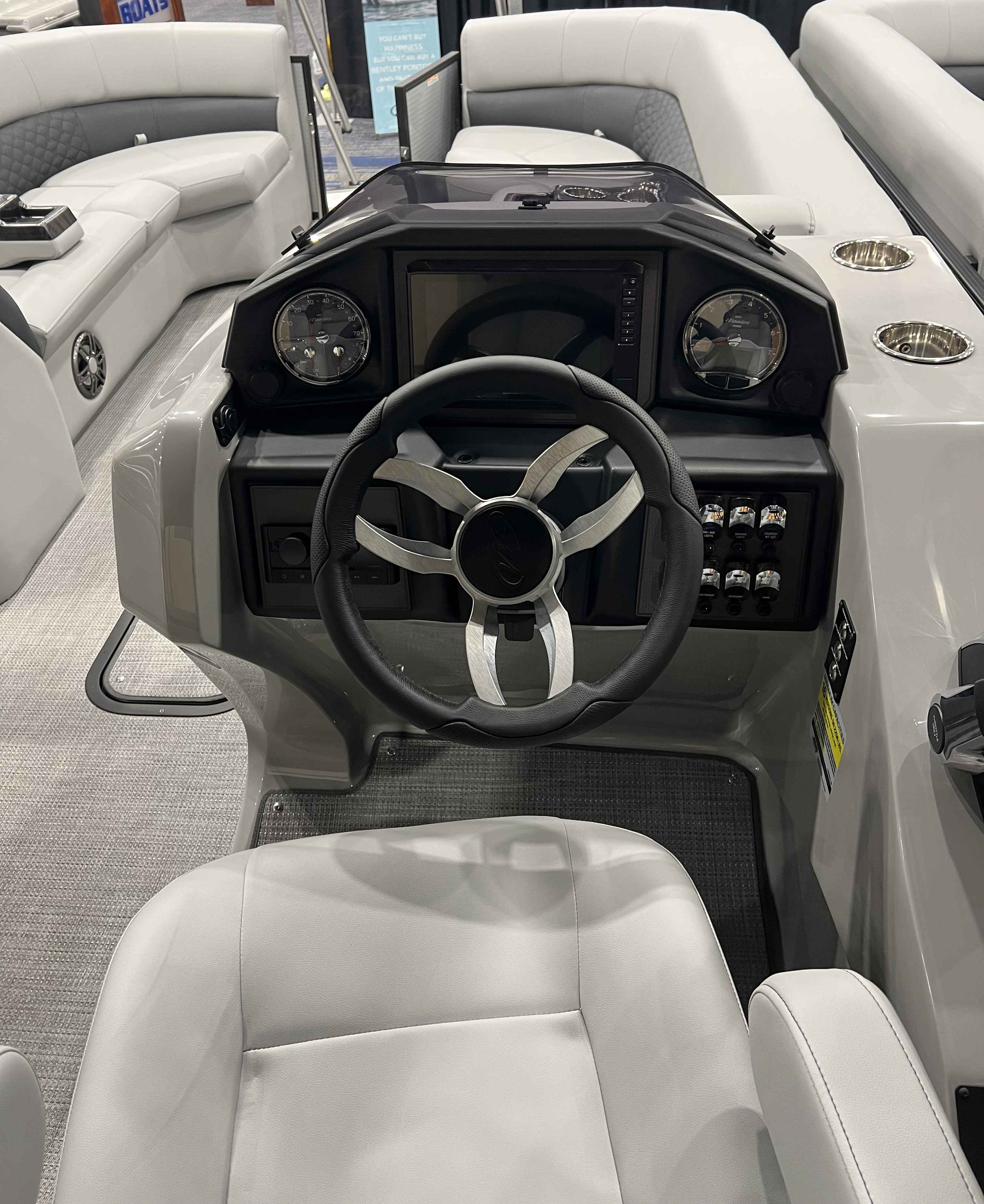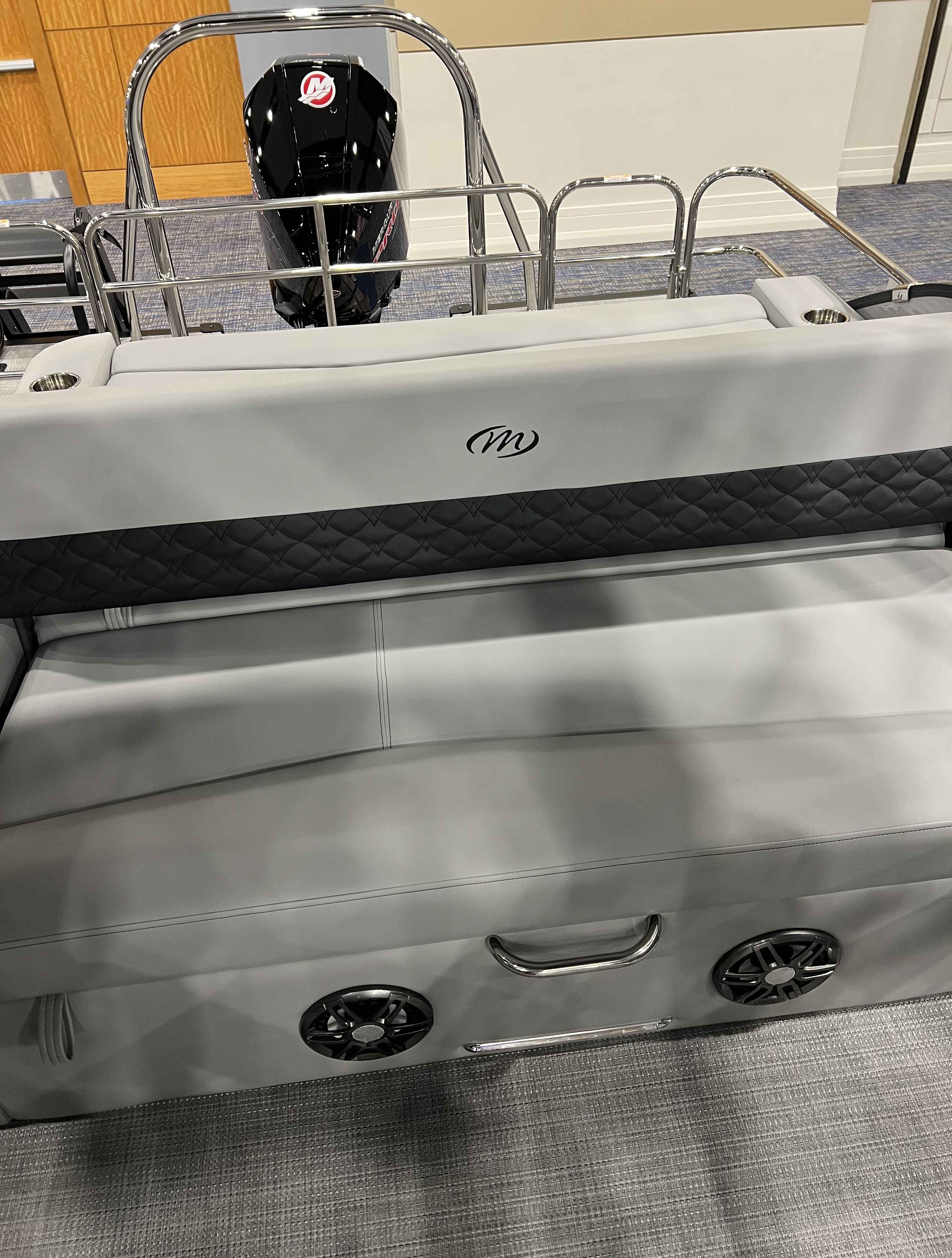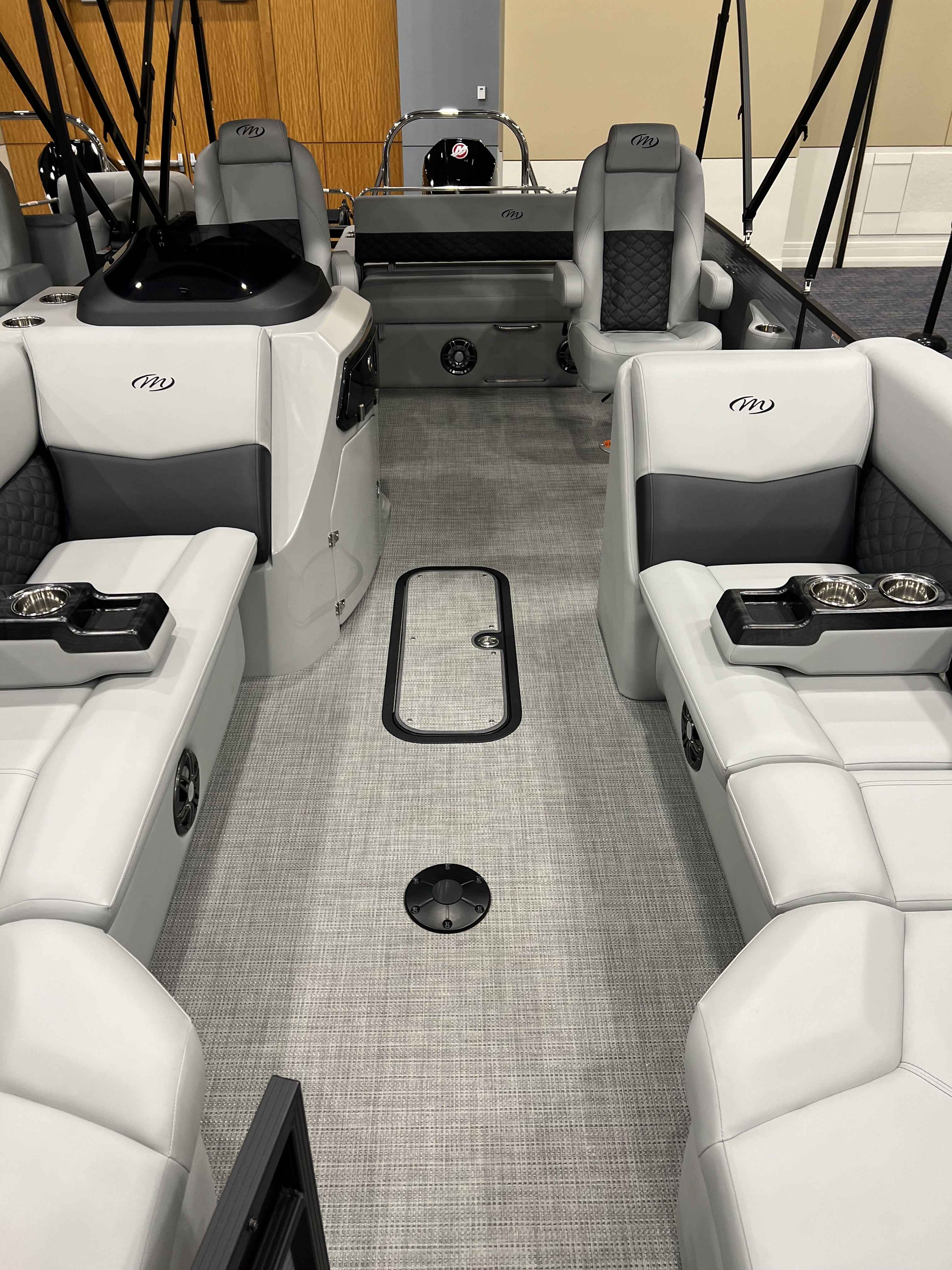 - Fully Transferable Warranty To Second Owner. Limited Lifetime On Decking Warranty and Structural Warranty. 5- Year Warranty On Furniture Vinyl Mooring Covers Floor Coverings and Bimini Fabric. 7- Year Component Warranty. Limited Lifetime Deck Warranty. LED Bimini Anchor Light. Bimini w/ Bimini Top and Boot. Mooring Cover. Built-In Cupholders and 2 Portable Cupholders. Woven Vinyl Flooring. Comfort Touch Marine Vinyl Furniture Hands Free Seat Hinges. Gas Tank - V-Toon 43 Gallon. Wide 4 Step Rear Entry Ladder. Blue LED Lighting on the Interior. LED Lighting for the Wall and Docking/Navigation. Color Matched Mooring Cover. Master On/Off Battery Switch. Dinette Table. USB Port at the Helm. Garmin Display ( Echo Map Plus 9"). Raised Fiberglass Helm Chair w/Slide Access Door. High Back Helm Chair w/Recliner. Helm Chair Slider. Horn. LED Courtesy Light. Sound System ( Fusion Stereo and 4 Speakers). Premium Steering Wheel. Windscreen. Extruded Aluminum Crossmembers. Stainless Steel Fasteners. Hybrid Rotomold Furniture. Lift Gates. Flip Up Cleats Stainless Steel(4). Mooring Eyes. Motor Mount- Aluminum w/Splash Shields. NMMA Certified using ABYC Standards. Anti-Spray Integrated Splash Fins on Nose Cones. Full Length Pontoon Tube Riser. Riser Brackets (M Style). Powder Coated Rub Rail . Transducer Bracket. Deck draining Wall Spacers. Heavy Duty Wall Tubing ( .090" Thick 1.25"Sq.). Powder Coated Wall Tubing. VPII - Up to 200 HP ( VPII Center Tube Lifting Strakes (2) Barracuda Nose Cones and No Billet Transom). SHP- Up to 400HP ( Sea Star Power Steering SHP Lifting Strakes on All Tubes (6) Barracuda Nose Cones and Billet Transom on Top).